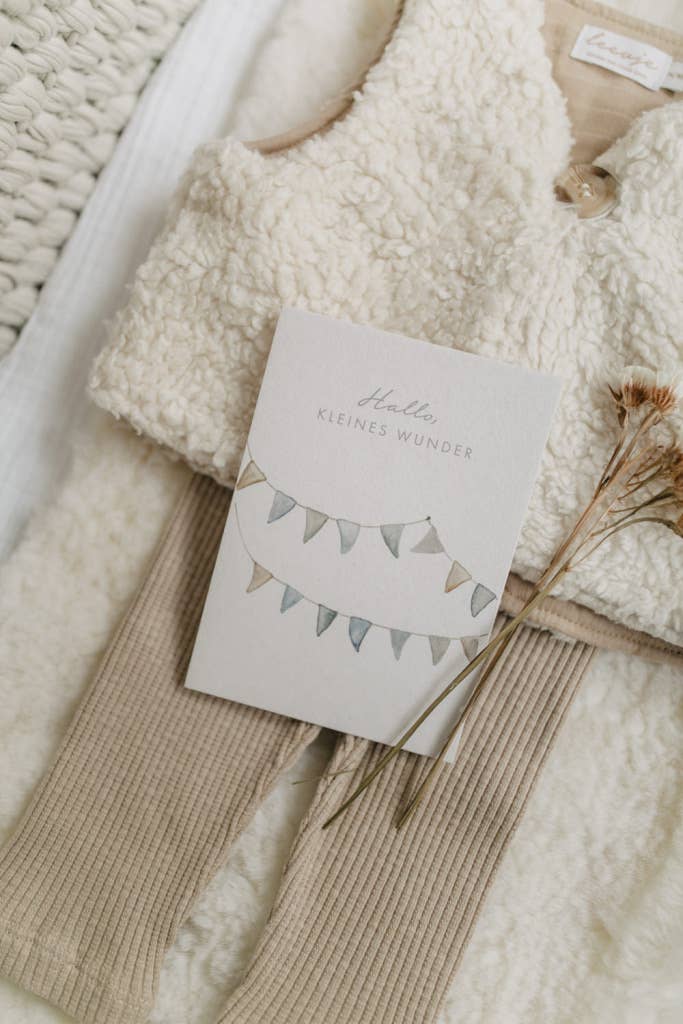 Unsere Karte Girlande "Hallo kleines Wunder" aus hochwertiger, stabiler Holzschliffpappe mit wunderschöner strukturierter und leicht cremefarbener Optik ist die perfekte Karte zur Geburt. Unsere Karten zeichnen sich durch ihre hochwertige Haptik aus und sie hübschen auch später als Wanddeko jedes Kinderzimmer auf.