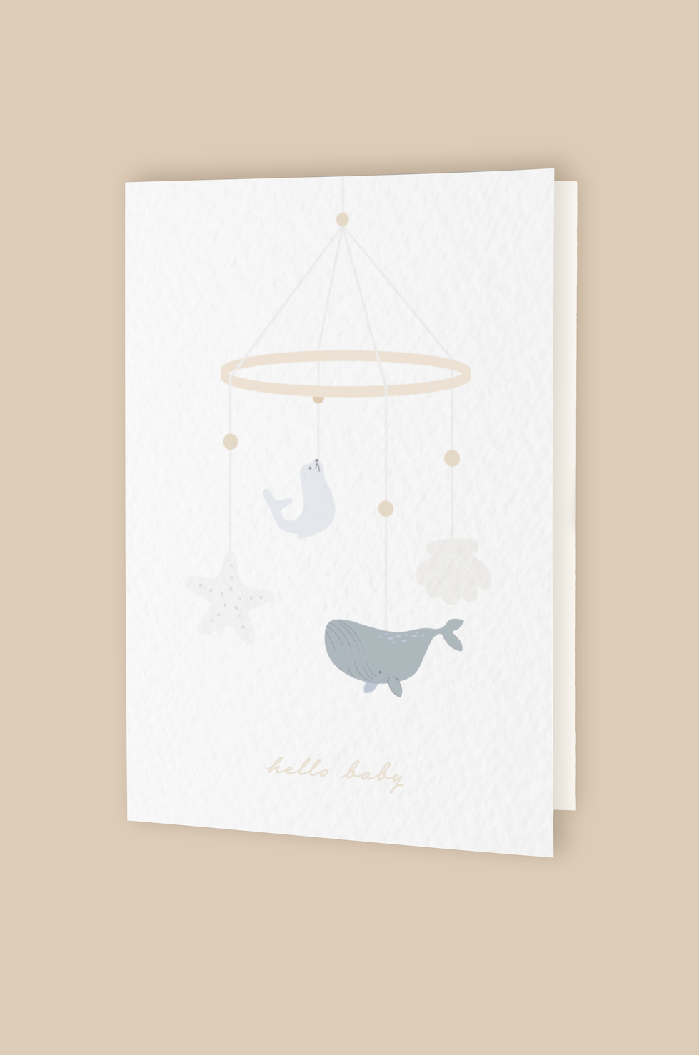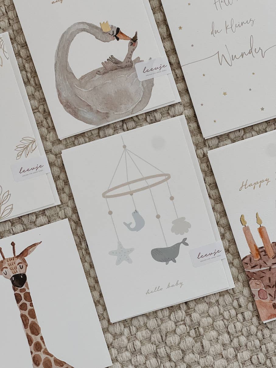 Unsere Klappkarte Mobile 'hello baby' ist eine wunderschöne Grußkarte. Die handillustrierten Motive und der Umschlag machen die Klappkarte zu einer ganz hochwertigen Karte für Glückwünsche.