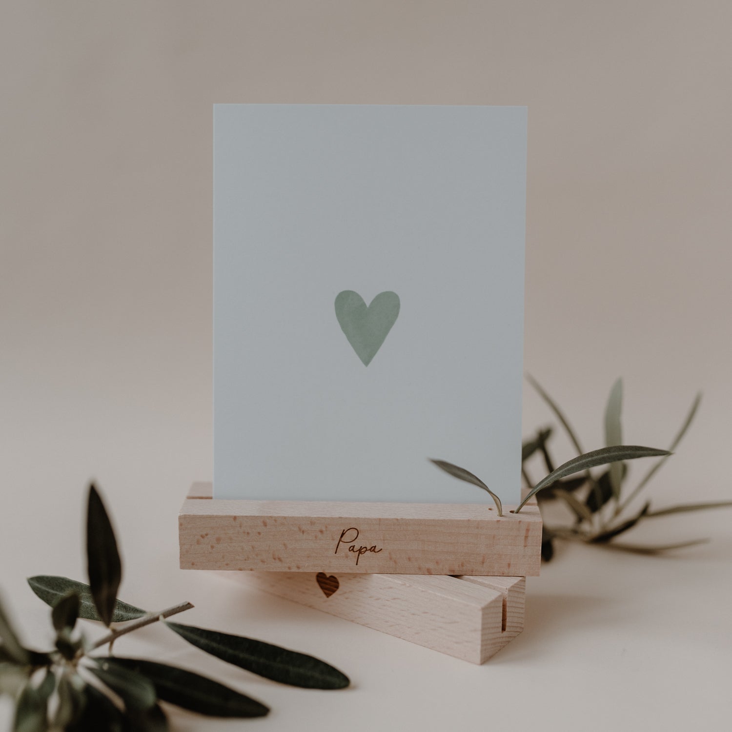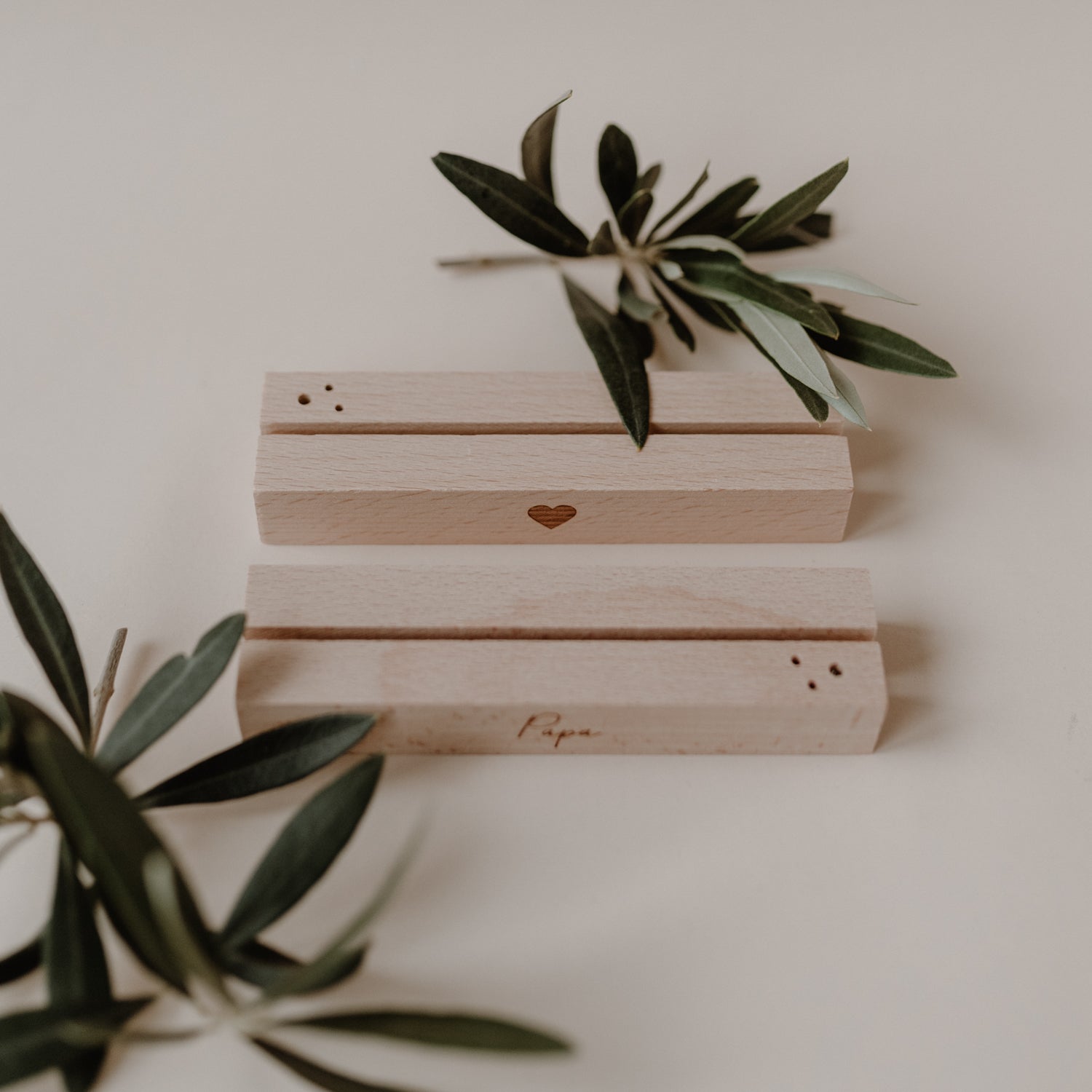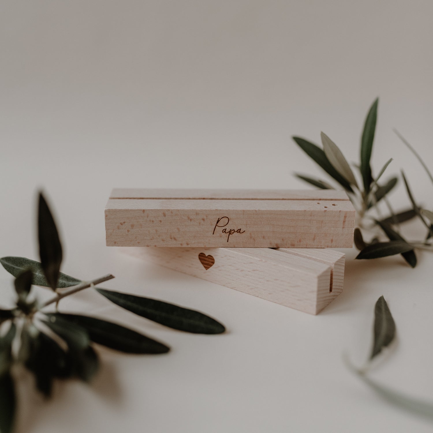 Das 2er Set besteht aus zwei Karten- und Blumenständern. Den einen Karten- und Trockenblumenständer ziert das Wort "Papa" und den anderen ein Herz. Auf der Unterseite befindet sich jeweils ein kleines Eulenschnitt Logo. Durch die Aussparung im Holz entsteht eine perfekte Halterung für Deine Liebhabsel. In den 3 kleinen Löchern finden 3 wunderschöne Trockenblumen Ihren Platz und setzen Dein Liebhabsel damit super in Szene. Ein schnelles Austauschen nach Lust und Laune ist somit problemlos möglich. Das Format eignet sich perfekt für Deine liebsten Fotos, Postkarten und Bilder.
