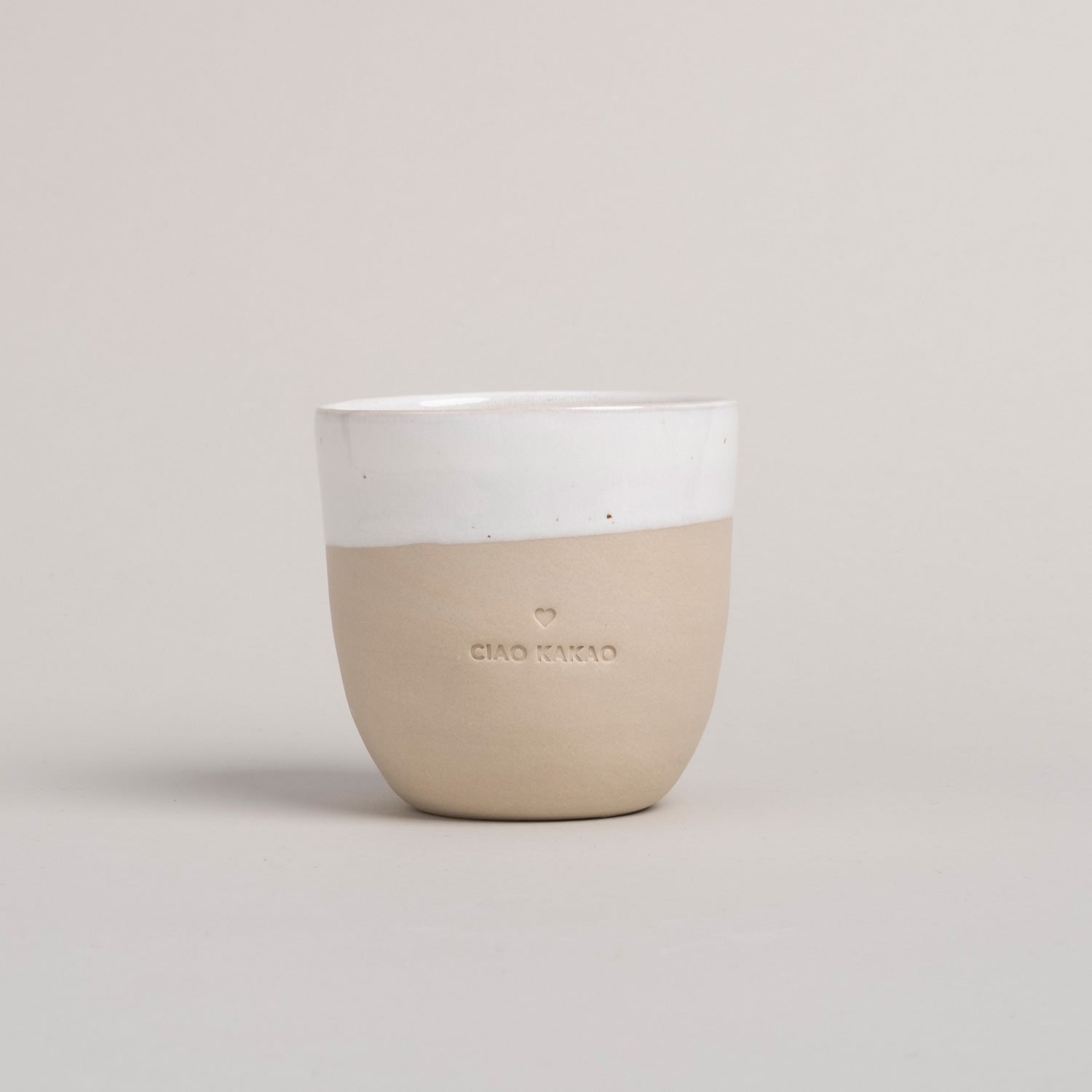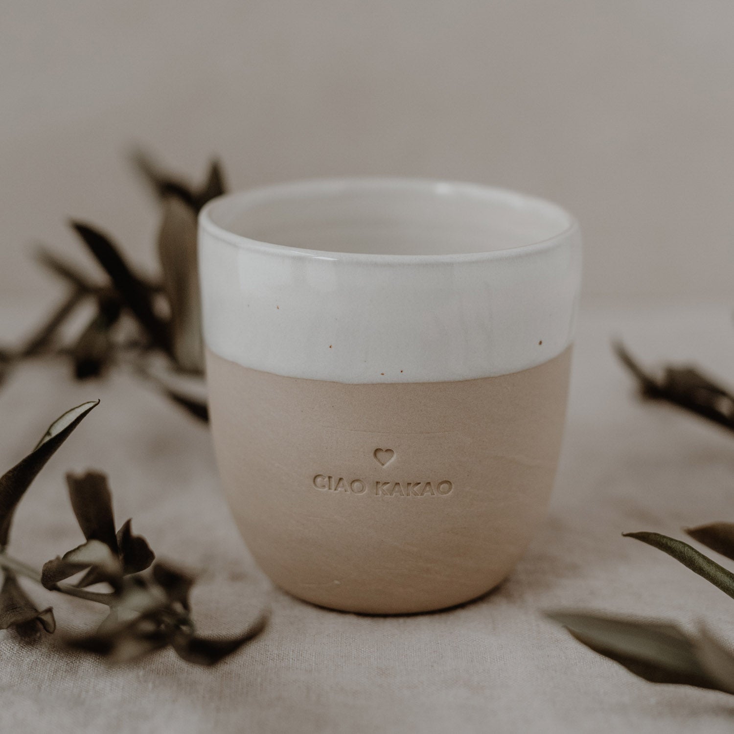Eine kleine Töpferei aus Portugal produziert diese wundervollen Becher in liebevoller Handarbeit. Diese Becher lassen die Herzen höher schlagen, denn jeder einzelne Becher hat seinen ganz eigenen Touch. Da sie per Hand gefertigt, gebrannt, geprägt, abgeschliffen, geglazed & nochmal gebrannt werden, gibt es Unterschiede in der Drucktiefe, in der Höhe sowie der Geradlinigkeit. Das minimalistische Design und die natürlichen Farbnuancen werden von der wunderschönen Blindprägung "Ciao Kakao" abgerundet.
