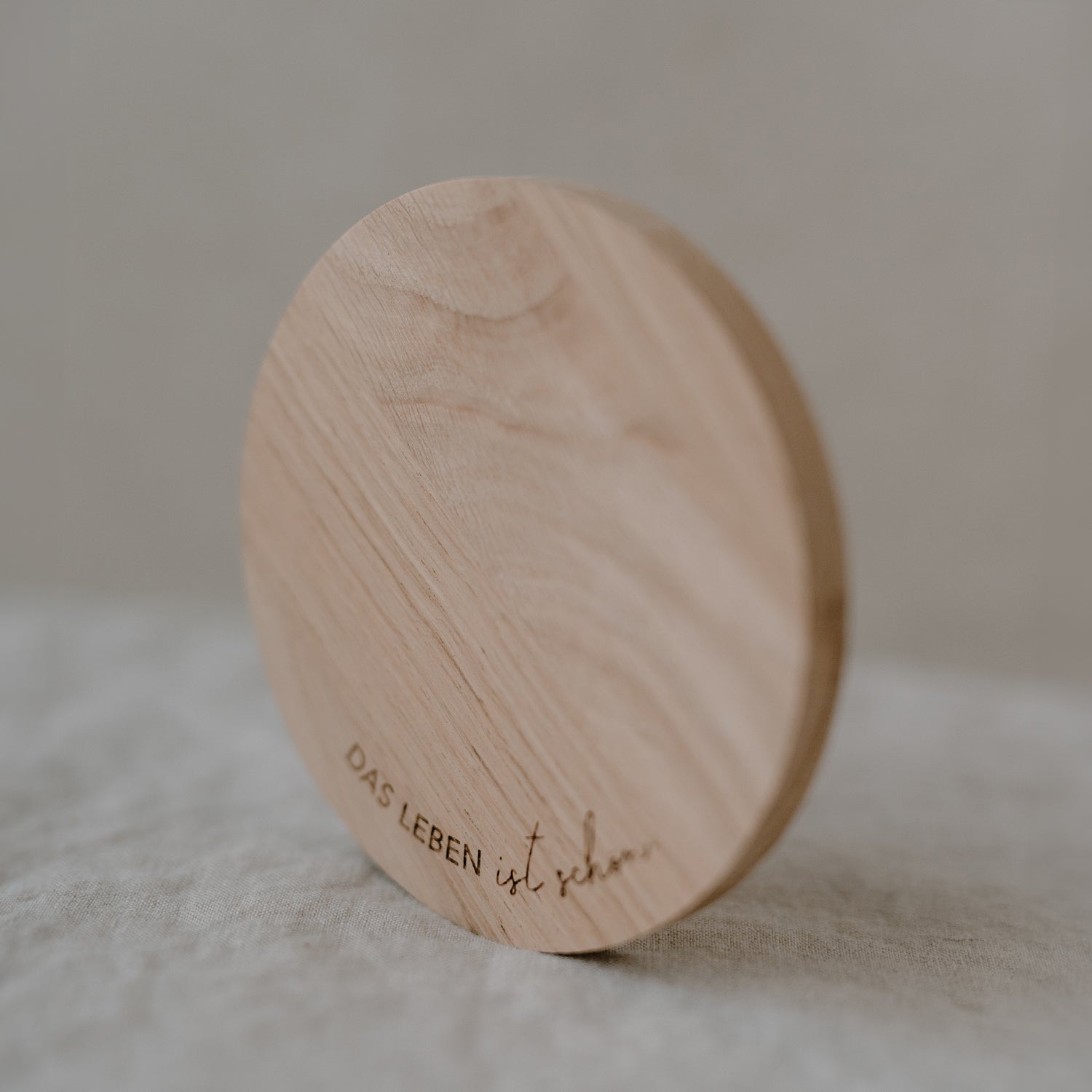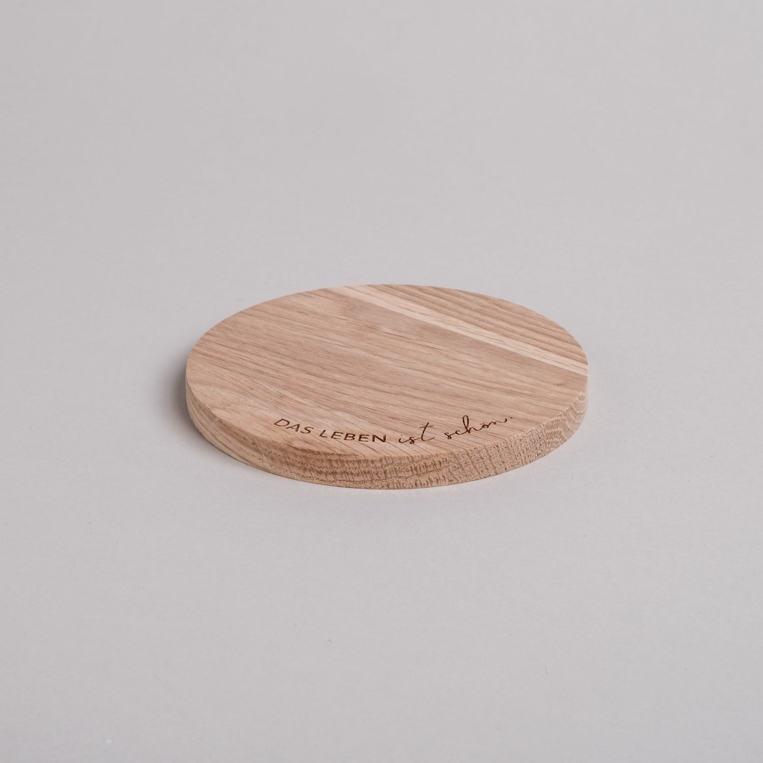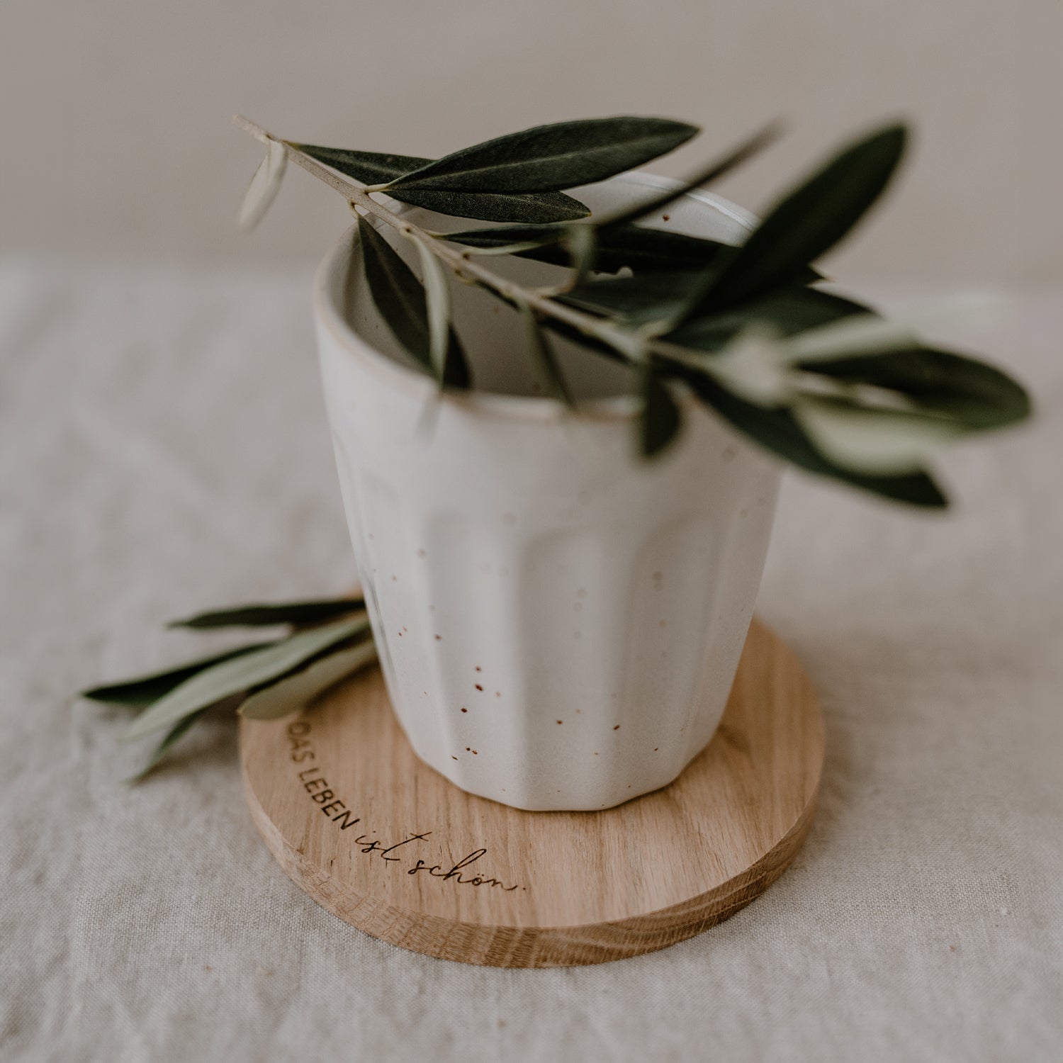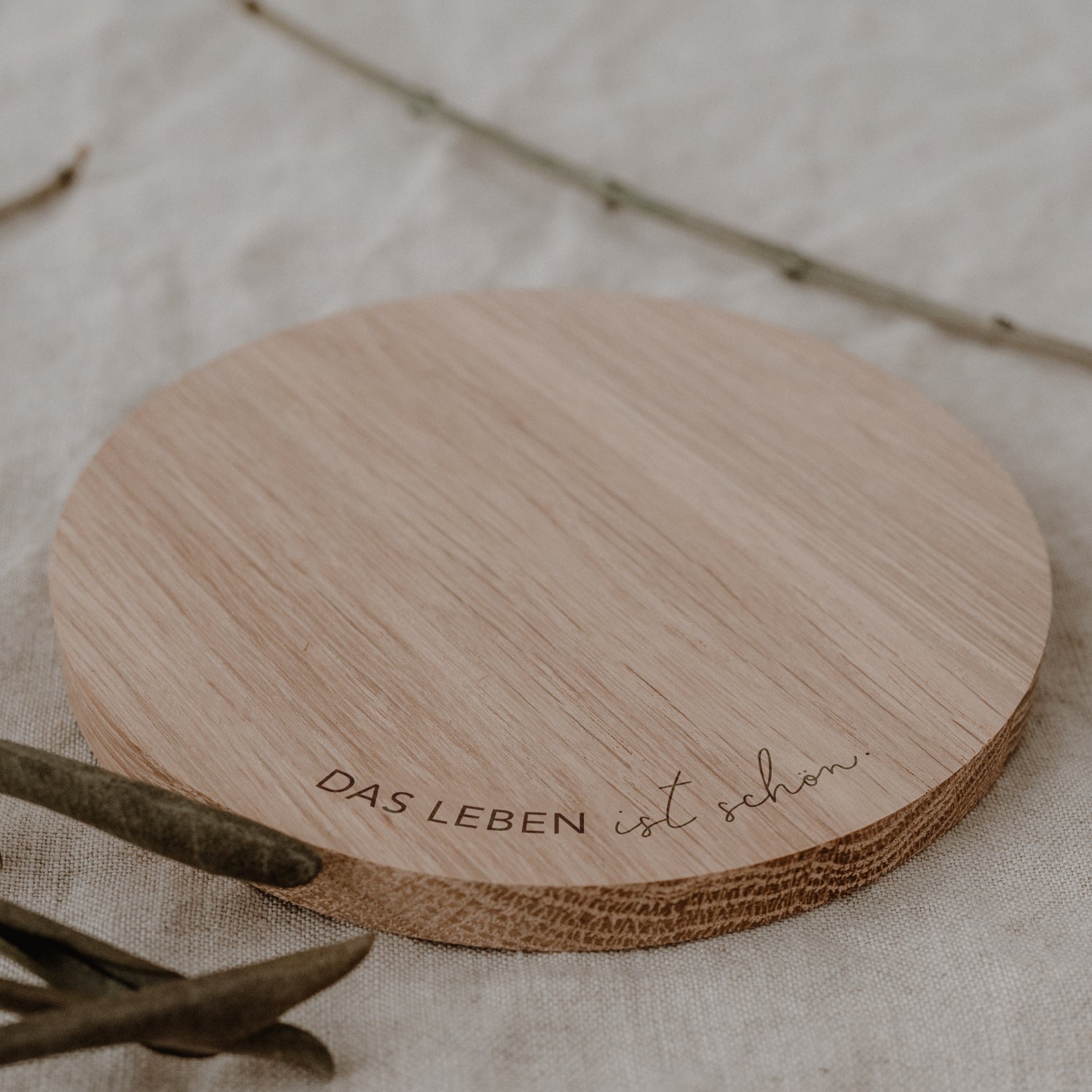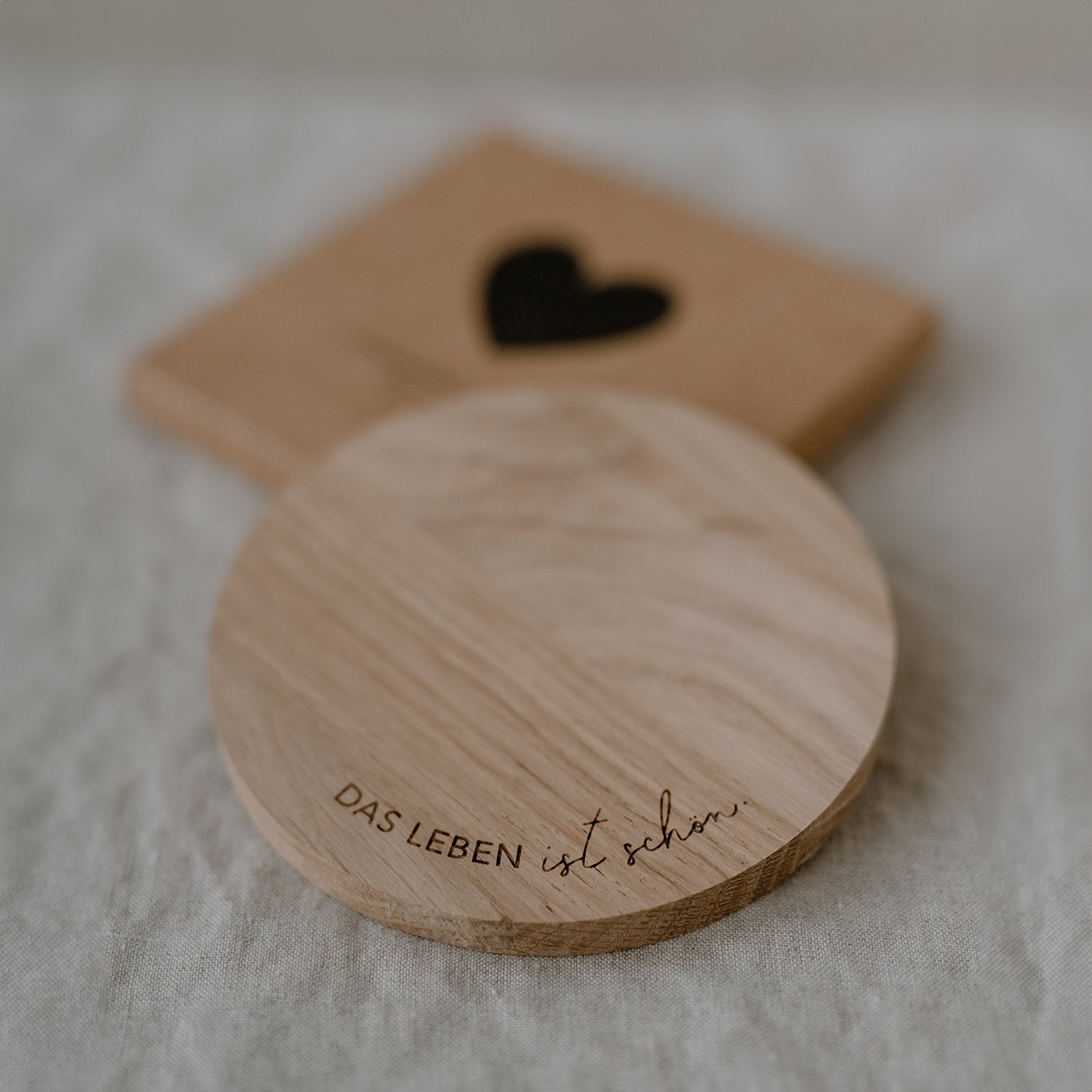 Die perfekten Begleiter zum Servieren von Getränken. Diesen Untersetzer ziert der handgeschriebene Spruch Das Leben ist schön auf der Vorderseite und das Eulenschnitt Logo auf der Unterseite.